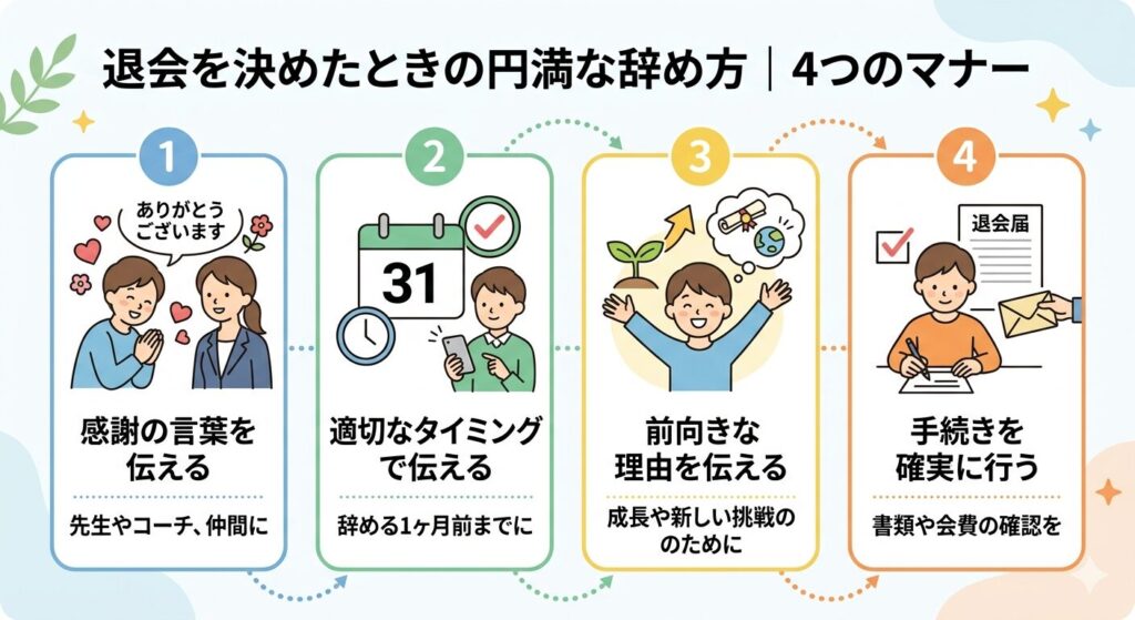 レベル3に該当する場合や、対話と工夫を尽くしても意志が揺るがない場合は、退会を決断すべき局面です。ただし習い事の退会は、単なる契約解除ではなく、地域社会の人間関係にも関わるデリケートな事案になります。以下の4つのマナーを押さえておきましょう。